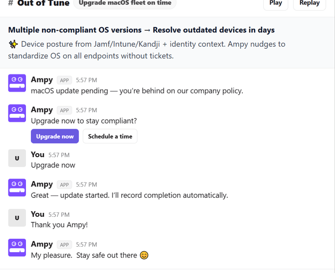 When a high-risk device is identified, Amplifier's AI security agent Ampy gets to work. Ampy comes with the Out of Tune track — an automation designed specifically to walk the employee through remediating noncompliant OS versions. Once triggered, Ampy reaches out to the device owner through Slack, Teams, or email and nudges them to update now or walks them through scheduling it at a more convenient time, all while answering questions and explaining context.
