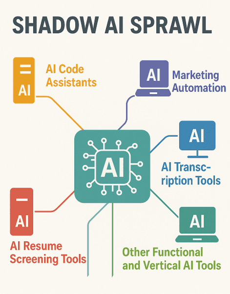 Shadow AI is the use of generative AI tools by employees without IT approval or oversight. Common culprits include ChatGPT, Claude, Gemini, GitHub Copilot, and multiple specialized AI assistants for everything from meeting transcriptions to data analysis.