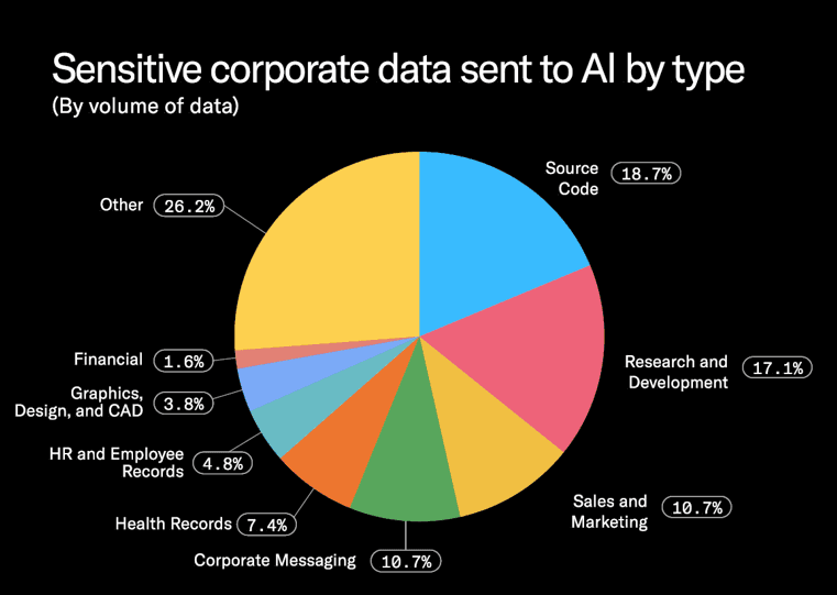 34% of all data that employees input into AI tools is classified as sensitive, which is a substantial increase from 10.7% observed two years ago. Unlike IT approved applications that let you maintain oversight, you have no control over data entered into the void of shadow AI. So that code your developer used Claude to debug? Voila, it’s now effectively “open source” for others – including your competitors.