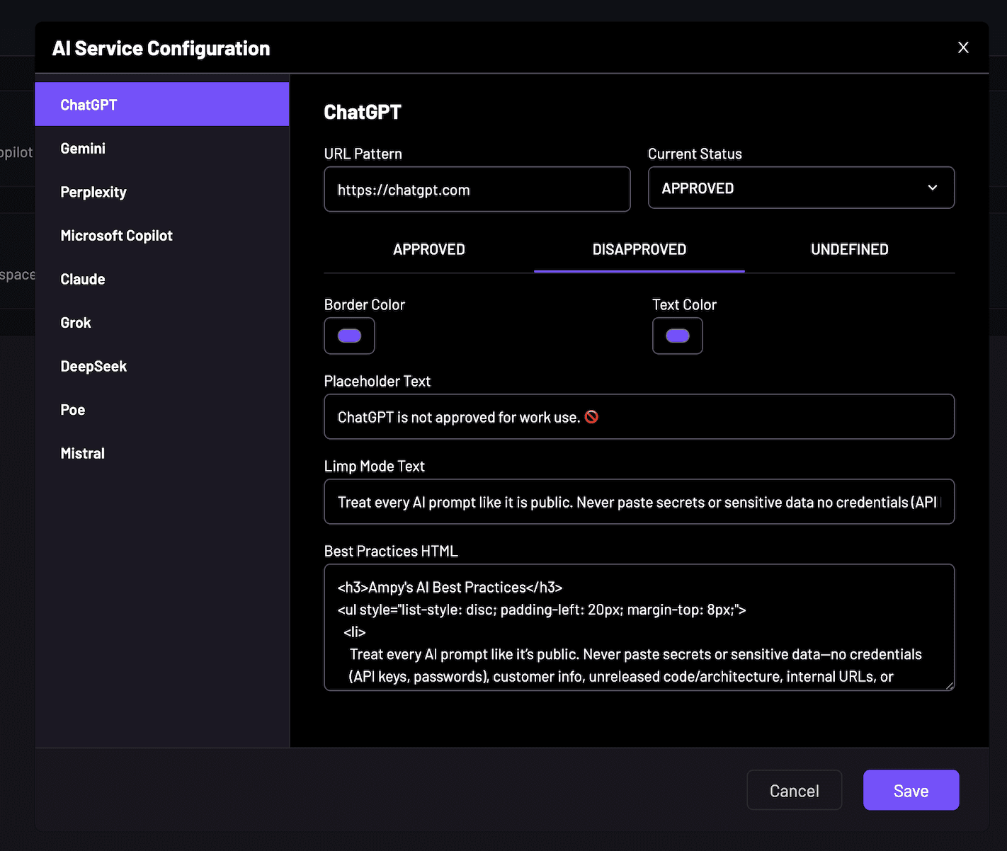 Train employees on AI risks with short, role-relevant modules. Coach them with best-practices overlays and prompt reminders inside the AI tools they actually use. Harden by discovering and governing unapproved AI services across the workforce. Shield by intervening in-browser at the point of GenAI interaction, preventing accidental exposure of protected information before it leaves the prompt box.